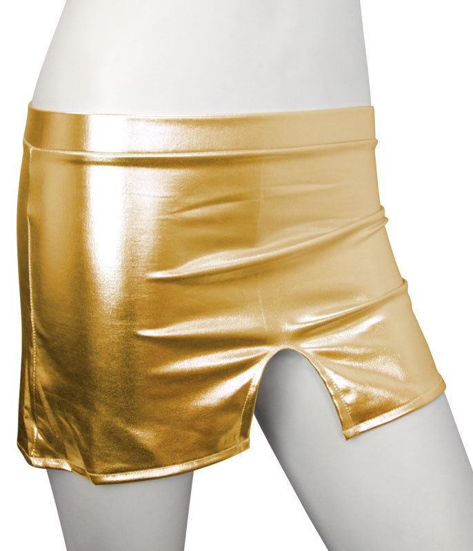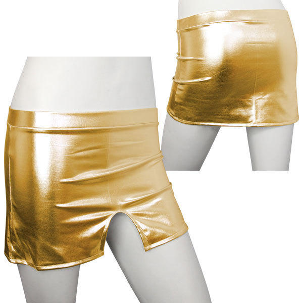 ●きらきら輝くメタリック風●ゴージャス気分なゴールド●セクシーに見せる超ミニ丈●片側のみカッティング入り●前後どちらでも着用可能。