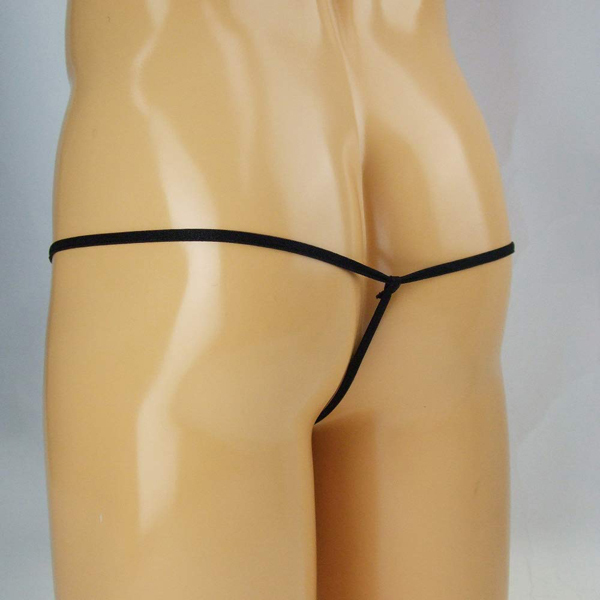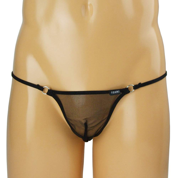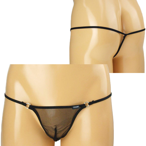 スケスケ素材で大胆に魅せる丸型サイドリング付の日本製のメンズ用Tバック(黒)。