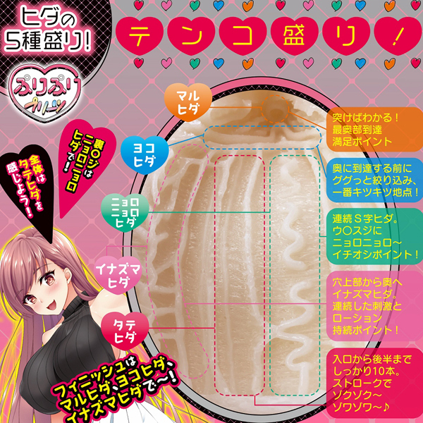 締まりの良い内部には、挿入部から最奥まで5種類のヒダをバランス良く配置!それぞれの異なる刺激と弾力あるボディで、ぷりぷりっとしたプリーツヒダの快感を楽しめる♪ローション付属