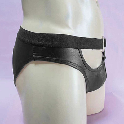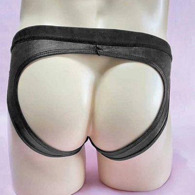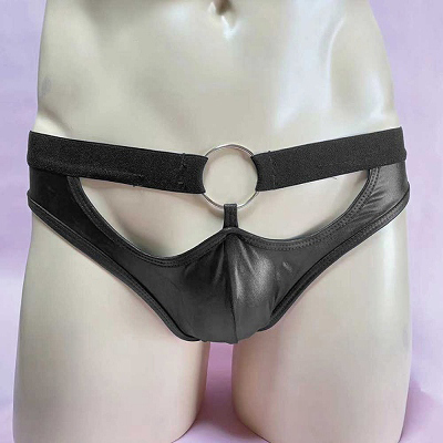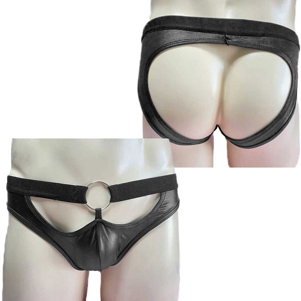 お尻部分がパックリ開いたセクシーなメンズショーツ!センターのリングがアクセントの光沢感あるブラックカラーがカッコいいデザイン!しっかりとした縫製ではき心地抜群です。
