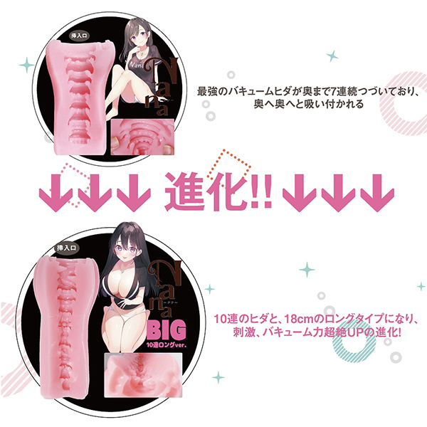 これまでにない新感覚!なんと10連続する逆テーパー型に配置された内部のヒダギミックが特徴の非貫通オナホ「NaNaBIG10連ロングver」です。