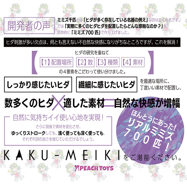 700本もの多彩なヒダを贅沢に配置した非貫通オナホ「カクメイキミミズナナヒャク」です。