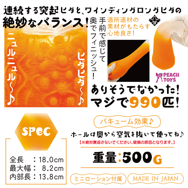 ミミズ千匹とは「ヒダが多く存在している名器の例え」ですが、実際に多くのヒダヒダを配置したらどんな感触なのか?ということをコンセプトに真面目に「ミミズ990匹」で作り上げました!フォルムはシンプルな筒型で、挿入口もいたってシンプル。
