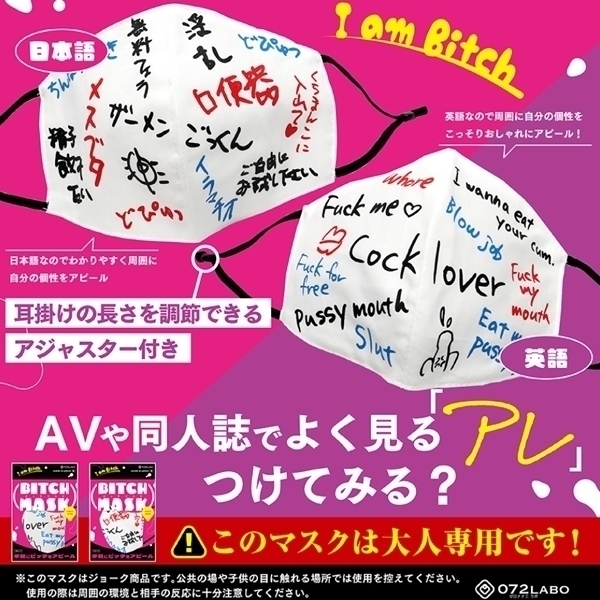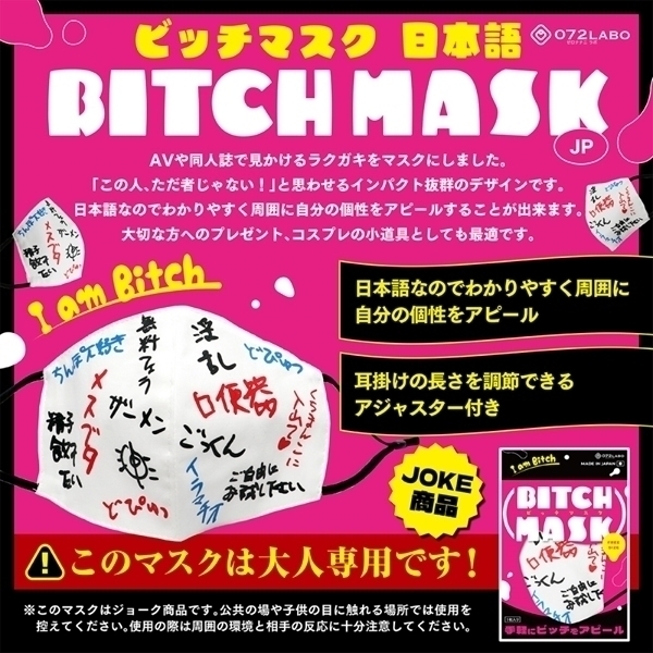 ビッチマスク(日本語版)は、インパクト抜群のユニークなデザインが特徴の大人専用マスクです♪AVや同人誌で見かけるラクガキをモチーフにしたこのマスクは、個性をアピールしたい方にぴったり!「この人、ただ者じゃない!」と思わせるようなデザインで、周囲にあなたの個性を伝えることができます♪しっかりとした生地で作られており、耳掛け部分は長さ調整が可能なアジャスター付きなので、フリーサイズで快適に装着できます!プレゼントやコスプレの小道具としても最適です♪ジョークグッズとして非日常を楽しむアイテムとして、ぜひお試しください!
