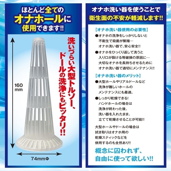 オナホールを傷つけずに洗浄できる専用クリーナーです!裏返すことなく内部までしっかり洗えるので、破損リスクを軽減できます♪やさしく洗える構造で繊細な素材にも対応!全長16cmの本体サイズで扱いやすく、収納にも困りません♪使い方は簡単で、水洗いのあとにゆっくり挿入して内部を洗浄!洗浄後はそのまま立てて自然乾燥も可能です♪底部は広めに設計され自立しやすく、安定性もアップ!本体は軽量で持ちやすいABS素材を使用し、日本製の高品質設計です♪オナホールを清潔に保ちたい方に最適なメンテナンスアイテムです!