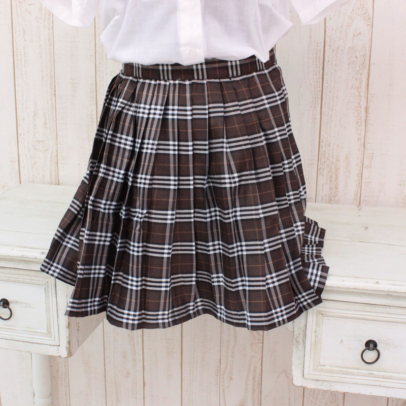 白いシャツにもピンクのシャツにも合わせやすい、意外と万能な優秀ブラウン!マジメ風にもラブリーにも対応できる、便利な制服プリーツスカートです。