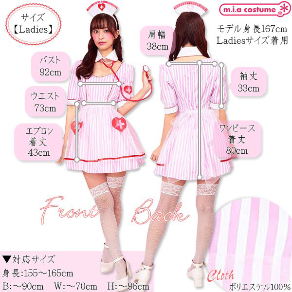 ■ サイズ・ セット内容 | Mサイズ 対応サイズ:身長155〜165cm・B〜90cm・W〜70cm・H〜96cm 実寸:B92cm・W73cm・肩幅38cm・袖丈33cm・着丈80cm、エプロン丈43cm セット内容:カチューシャ、付け襟、ワンピース(背中心ファスナー)、エプロン、腕章、聴診器 素材:ポリエステル100% |