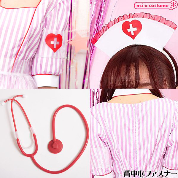 ハロウィン用のコスチュームとしてだけではなく、仮装コスプレとしてもどうぞ♪ストライプ生地に、オーガンジーの透けた紋章とエプロンがかわいいナースコスチュームです。