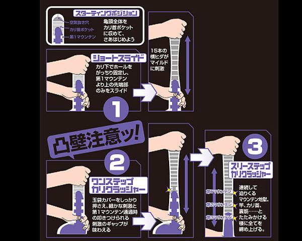 ●匂いがしない丈夫な柔らか素材●ローションは微量でOK●コンパクトに収納可能●36本の横ヒダが全体をまんべんなく刺激●高低差6mmのカリクラッシャーマウンテンを4つ配置●刺激構造がカリ首を潰すかの如くゴロゴロと大胆に刺激。