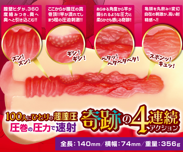 サオが潰れそうなほどの強烈圧力!圧迫感の中に感じる柔らかな膣道を進むと、亀頭が丸々と飲み込まれ、変幻自在な刺激で射精へ一直線♪膣壁がサオに合わせて動くという高膣圧を再現した356gの肉厚オナホ。