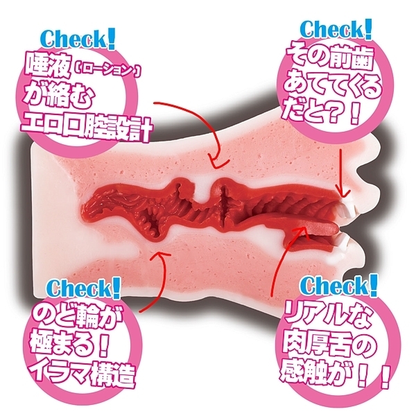 口腔内部は唾液(ローション)がより絡む設計になっており、ホール内部のピンはのど輪が極まりやすいイラマ構造を採用しています。