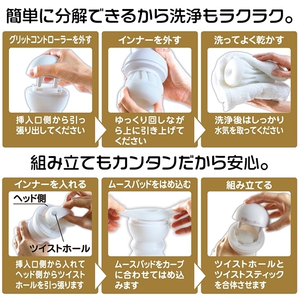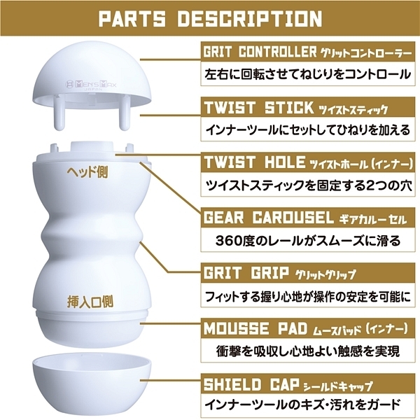 グリットコントローラーは右にも左にも回せます、右と左のひねる方向で内部構造も変化する!お好みのひねり具合で吸着感をコントロール!<内部構造>@グラインドスクリュー 掘削機をモチーフにした最奥ゾーンAツインスクリュー 2種類の縦型スクリューで締め上げるBビッグスクリュー 肉厚なスクリューが根本をホールド