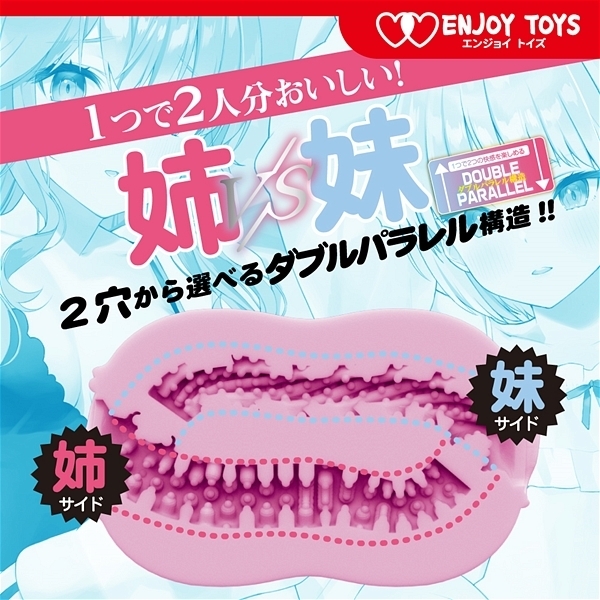 キツキツでボコボコしていてクポクポな2通りの刺激が楽しめる!1つで2つの快感を楽しめるダブルパラレル構造が特徴の非貫通オナホ「ダブルスおっとり姉とツンデレ妹」です。