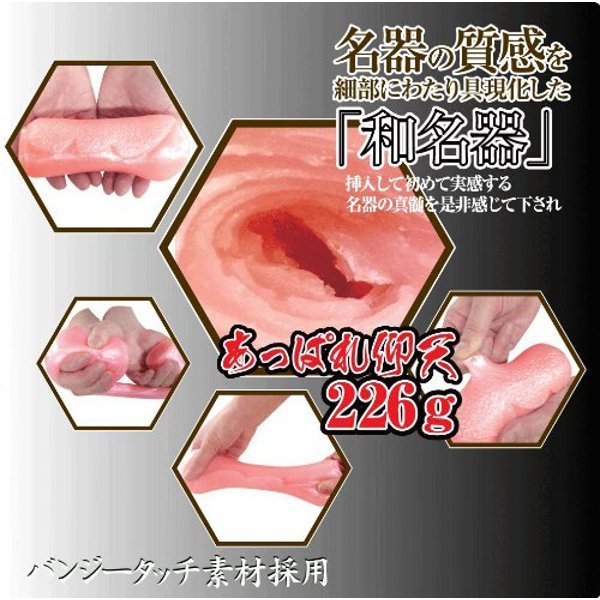 殿方を極楽へと誘う、日本製和名器「お千代」の内部は快感の無次元構造!恍惚と並ぶ悦感膣丘、淫靡に包み込む乱舞粒に加え、激しく圧しつける旋律の肉内壁を見事に再現!膣のうねりに悶え踊りながら、ヒダと粒がねっとり絡みつく絶頂名器オナホールです。