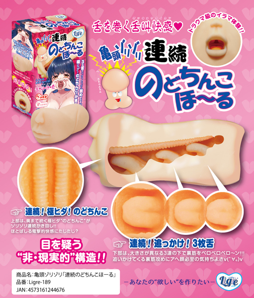 喉の奥までズッポズポ!挿入すると3枚の舌が裏筋を3回ゾリゾリっと刺激する♪肉厚素材でプレミアムローション付きの非貫通オナホール!のどちんこでかき回す舌叫快感をぜひお楽しみください。