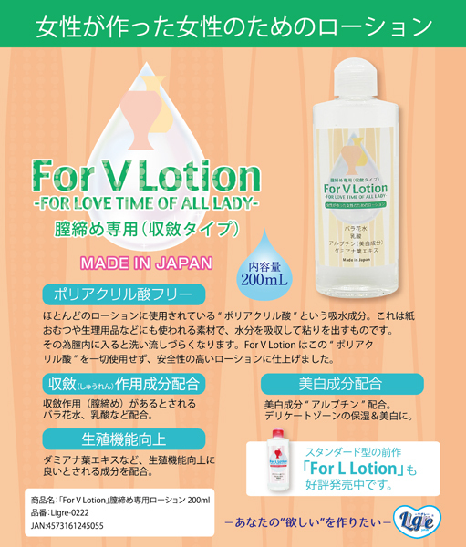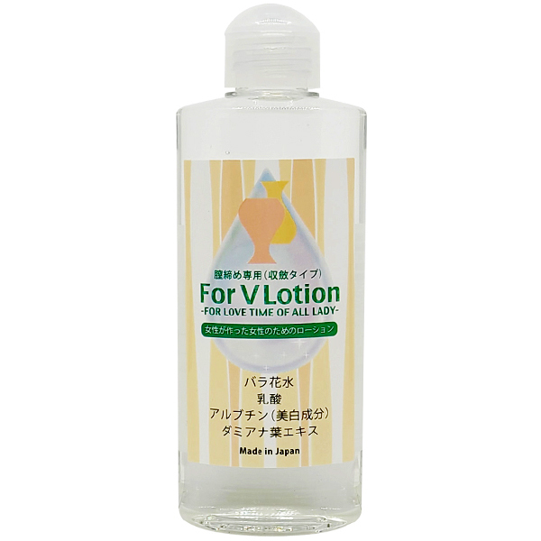 バラ花水、乳酸、アルブチン(美白成分)、ダミアナ葉エキスなど美白効果が期待できそうな良成分がしっかり入った「For V Lotion 200ml」。