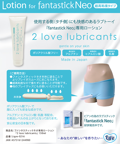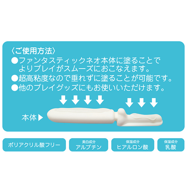 あの人気商品「ファンタスティックネオ専用ローションで、膣に入っても安全な化粧品レベルの安全性が特徴!チューブタイプなので適量を取り出しやすく、美白成分アルブチン、保湿成分ヒアルロン酸、乳酸が入った化粧品レベルの仕上がりとなっております♪歯磨き粉のような硬さ超高粘度!スティックに垂れる事なく塗る事ができて使いやすい♪ファンタスティックネオだけじゃなくバイブやローターなど他のグッズにもお使いいただけます。