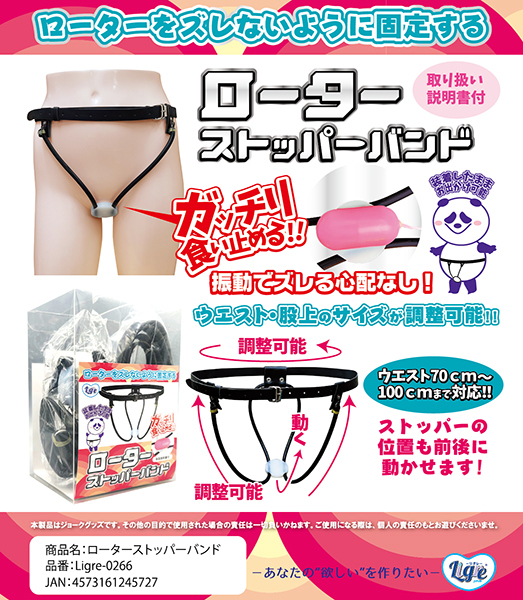 ローターをしっかり固定する「ローターストッパーバンド」の登場です!ローターを固定したい!ずっと股間に当てておきたい!しかしズレるし動く…そんな時には、このローターストッパーバンドです!履くタイプのベルトが付いており、そこにゴムで簡単に装着可能!ローターを固定する台座が付いているので、そこにローターを固定すれば絶対に外れない!これはあらゆるプレイに使えそうだ!ローターパンツなどもありますが、結局はローターの振動でしっかり固定する事は不可能です。