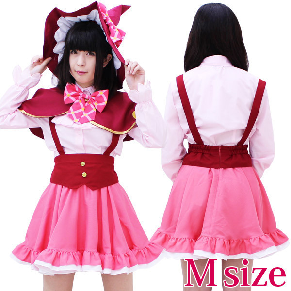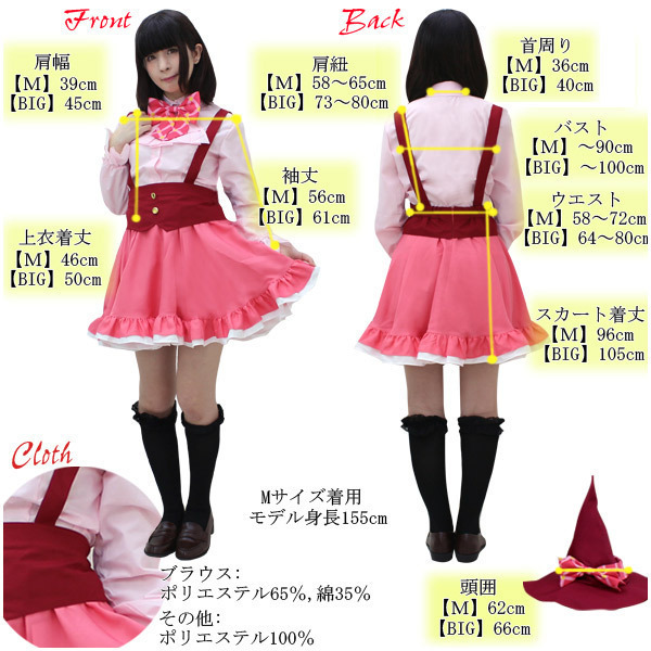 | ■ サイズ・ セット内容 | Mサイズ:B〜90cm・W58〜72cm ブラウス(肩幅39cm、袖丈57〜60cm、着丈58cm、首回り36cm) スカート(丈46cm、肩紐58〜65cm) 帽子:頭囲62cm セット内容:ブラウス(前ボタン・袖口ゴム)、フリルタイ、リボン、肩紐付きスカート、ケープ(前スナップボタン留め)、リボン付き帽子(リボン固定用のスナップボタン付) | ||