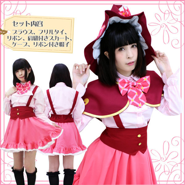 ●花びら風の袖口が可愛いブラウス●パステルピンクのフリルタイ付き●裾フリルたっぷりの吊りスカート●ウエスト後ろゴム&ファスナー●金模様も忠実に再現したケープ●チェック柄リボン付きとんがり帽子●首元用のおそろい柄リボンもセット。