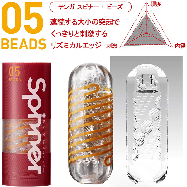 上下運動に連動してスピンする「TENGA SPINNER」に、伸縮性を高め、強力回転を生み出した新作が登場!05ビーズは、渦を巻くように配置された大小の突起がリズミカルに刺激するスパイラル構造。