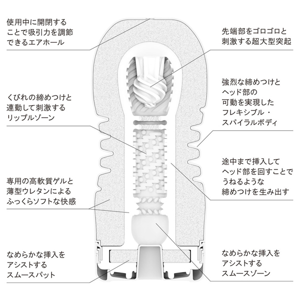 「ローリングヘッドカップ」は、力強い締めつけを生み出すフレキシブルなスパイラルボディと内蔵された大きな突起が特徴。