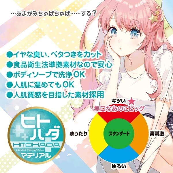 上下に設置されたイボ突起がサオを軽く甘噛み、奥の子宮口でチューっと吸い付き刺激♪素材には高品質で耐久性に優れたヒトハダマテリアルを採用!程よい弾力でもっちり肉厚ボディの気持ちいい非貫通オナホです。