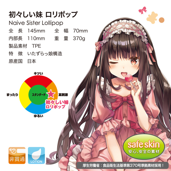 安心安全素材のセーフスキン!食品衛生法基準第370号準拠素材採用の非貫通型オナホ「初々しい妹 ロリポップ」です。