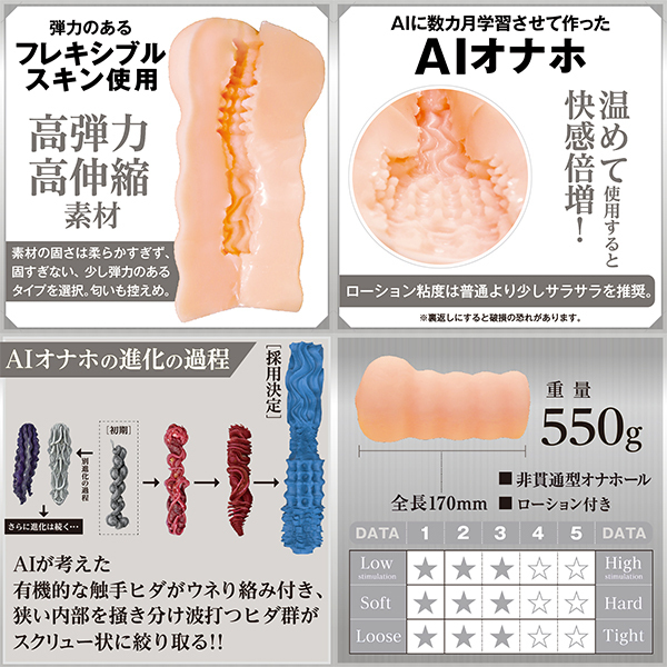 前半:人工AIが考えた触手ヒダがウネり絡み付く!中盤:狭い内部を掻き分け竿全体を包み込む快感が押し寄せる!後半:波打つヒダ群が絡みつきスクリュー状に搾り取る。