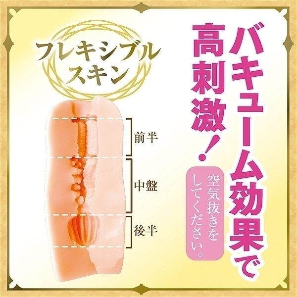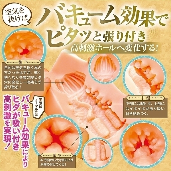 空気を抜けばバキューム効果でピタッと張り付き感触が変化する!挿入方向自由!左右上下あらゆる方向から使用可能(メーカー推奨は中央にS字の縦ヒダがある方が下部です)。