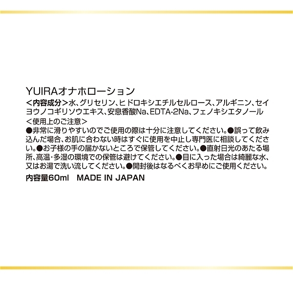 YUIRAより、使いやすいミニボトルサイズ(60ml)のローションが5種類一挙リリース量が多すぎる持ち運びずらい、そんなアナタにピッタリの商品です!オナホ専用配合!アルギニン、ノコギリヤシ成分によりチ〇コの持続力UP!使用しながらチントレも出来ちゃいます!ウォーターベースだから肌馴染みが良く、洗い流しも簡単♪ホール使用時のスタンダードモデルです!安心安全の日本産商品です。