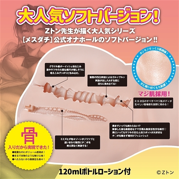 Zトン先生が描く大人気メスダチ公式オナホール今回も前回に続き、更に柔らかプルルンッ?ソフトバージョンで登場!生意気ボーイッシュ娘のわがままボディを再現するために、こんなところに拘りました!◎パッケージイラストはZトン先生描きおろし!◎マガこれ独自素材「マジ肌」採用。