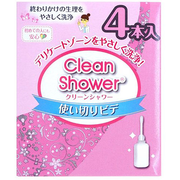 デリケート部分を優しく洗浄!初めての方にも安心してお使いいただける、携帯に便利な使い切りビデ「クリーンシャワー」(4本入り)です。