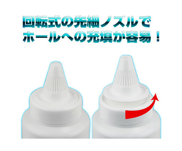 回転させるとオープンする先細り型のスクリューノズルで注入もラクラク♪洗い流し不要で後処理も簡単です。