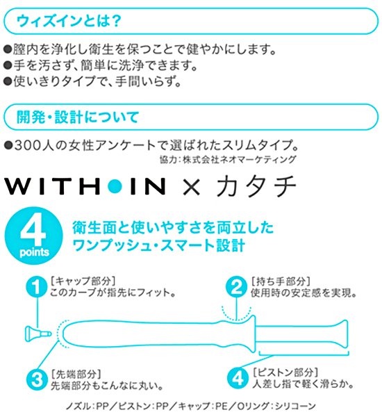 安心成分だけを厳選し、使用感はとってもナチュラル◎スリムタイプなので挿入が苦手な人でも安心!ウィズインで膣ケアをして日頃の不快感から解放されよう♪管理医療機器
