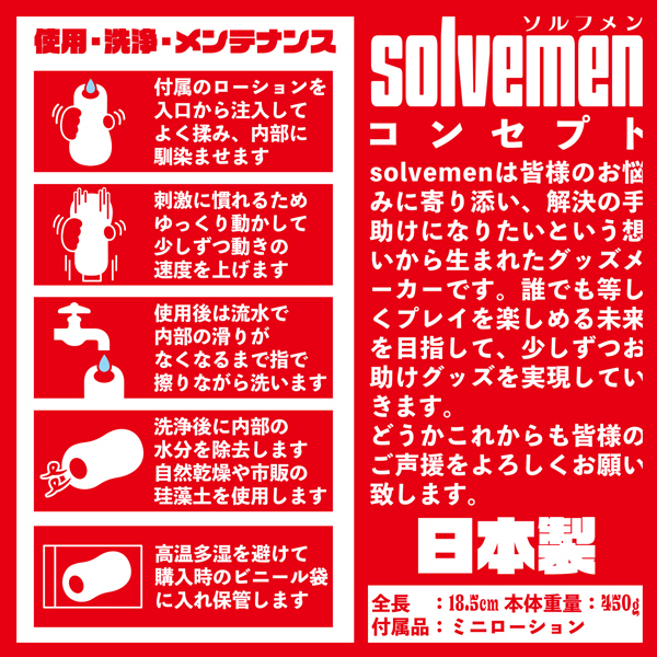 様々な人の悩みをなんとか解決したいというコンセプトをもとに生まれた「ソルブメン」より、すっぽり包み5つの縦ヒダで弾くように刺激する♪全長18.5cm、重さ450gのビッグな日本製の非貫通オナホが登場。