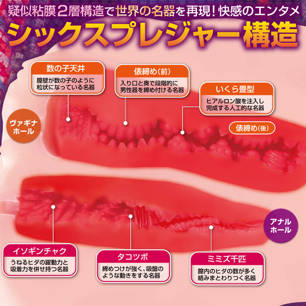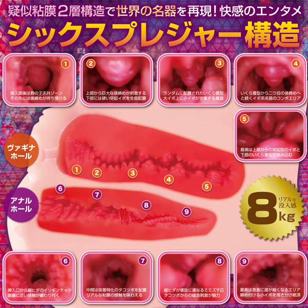 成人女性のまんま実物大サイズの臨場感溢れるリアルなフォルム!世界の名器を完全網羅したシックスプレジャー構造の大型非貫通オナホールです。