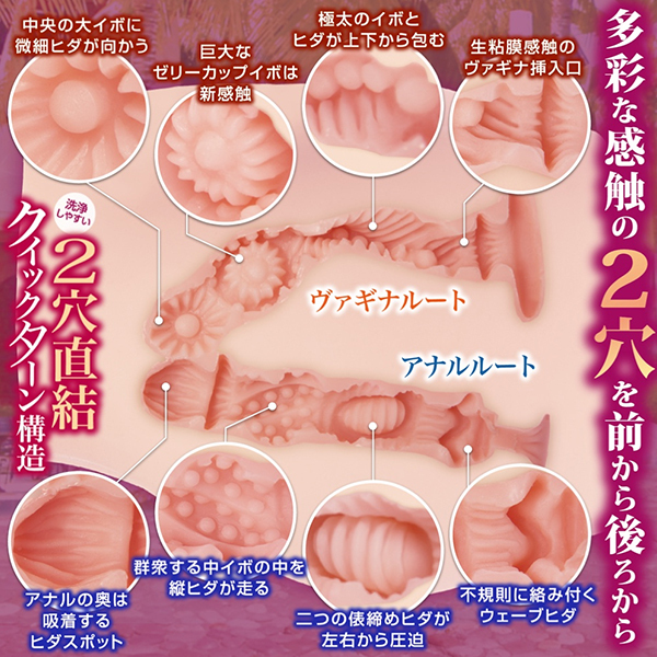 それぞれ個性の異なる「4種類のギミック」があり、多彩な感触の2穴を【前から後ろから】お楽しみいただけます。