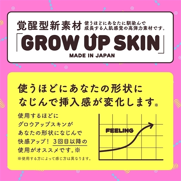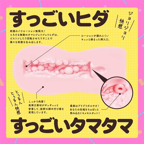ジョリジョリ刺激と猛烈なヒダによる快感!とぅるんとぅるんのすごい快感♪正反対の2つの刺激が奇跡のコラボレーションを遂げた非貫通オナホ「極たまヒダばーじん」です!摩擦ZEROのなめらか極玉密集地帯を縦横無尽にうねり走る極太の肉ヒダが凄まじい♪ぷにゅぷにゅと蕩けながら遅い狂うようなジョリジョリ刺激!これはまさに未体験の絶対快感♪ピストンしたり回転させたりすることで刺激のバリエーションが無限大に広がります!覚醒型素材「GROW UP SKIN」を採用し、使えば使うほどにあなたに馴染んで成長する人肌感覚の高弾力素材が心地良い♪直接肌に触れるものだから安心の国産素材を使用!パッケージイラストは人気絵師すーぱーぞんび氏を起用。