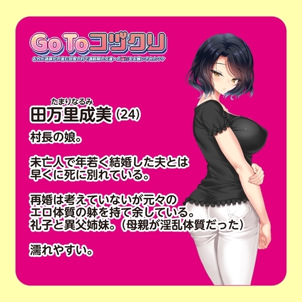 FANZA同人で人気の作品「Go To コヅクリ〜おれが過疎化の進む田舎の村で適齢期の女たちへの種付をお願いされたワケ〜」とmousou-toysとのコラボ作品。